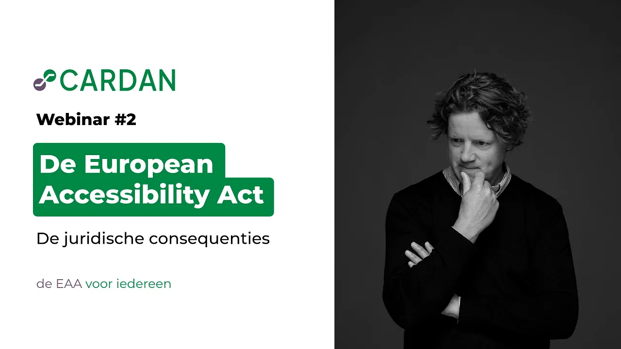 Vandaag, zullen het hebben over de juridische consequenties dus de risico's en boetes bij non compliance . En na deze webinar zullen er nog zes webinars komen waarbij we stap voor stap werken naar die toekomstbestendigheid . Wat moet je nou doen en wat kun je doen om het te monitoren, te onderhouden en natuurlijk toegankelijkheid te innoveren ? De vorige webinar, die is zowel op YouTube als op onze website terug te vinden . Dus mocht je die terug willen kijken, kijk dan vooral natuurlijk op www.cardan.com . Of zoek ons op YouTube .
